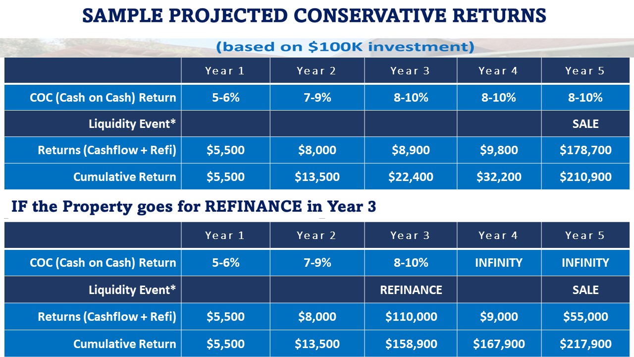 Based on the profit split between GPs and LPs all rental cashflow is shared between LPs and GPs. Similarly, when the property is refinanced or sold, all proceeds are split based on the LP / GP Profit Split.